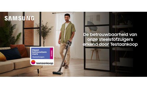 Ervaar een lange schoonmaaktijd zonder op te laden, passend bij jouw levensstijl. Dankzij de krachtige batterij behoudt de stofzuiger zijn zuigkracht tot maar liefst een uur*. Bovendien kan de schoonmaaktijd eenvoudig worden verlengd tot twee uur* met het gebruik van een reservebatterij**. Dankzij de technologie van Samsung blijft de batterij ook 70% van zijn oorspronkelijke prestaties leveren tot 500 cycli***.