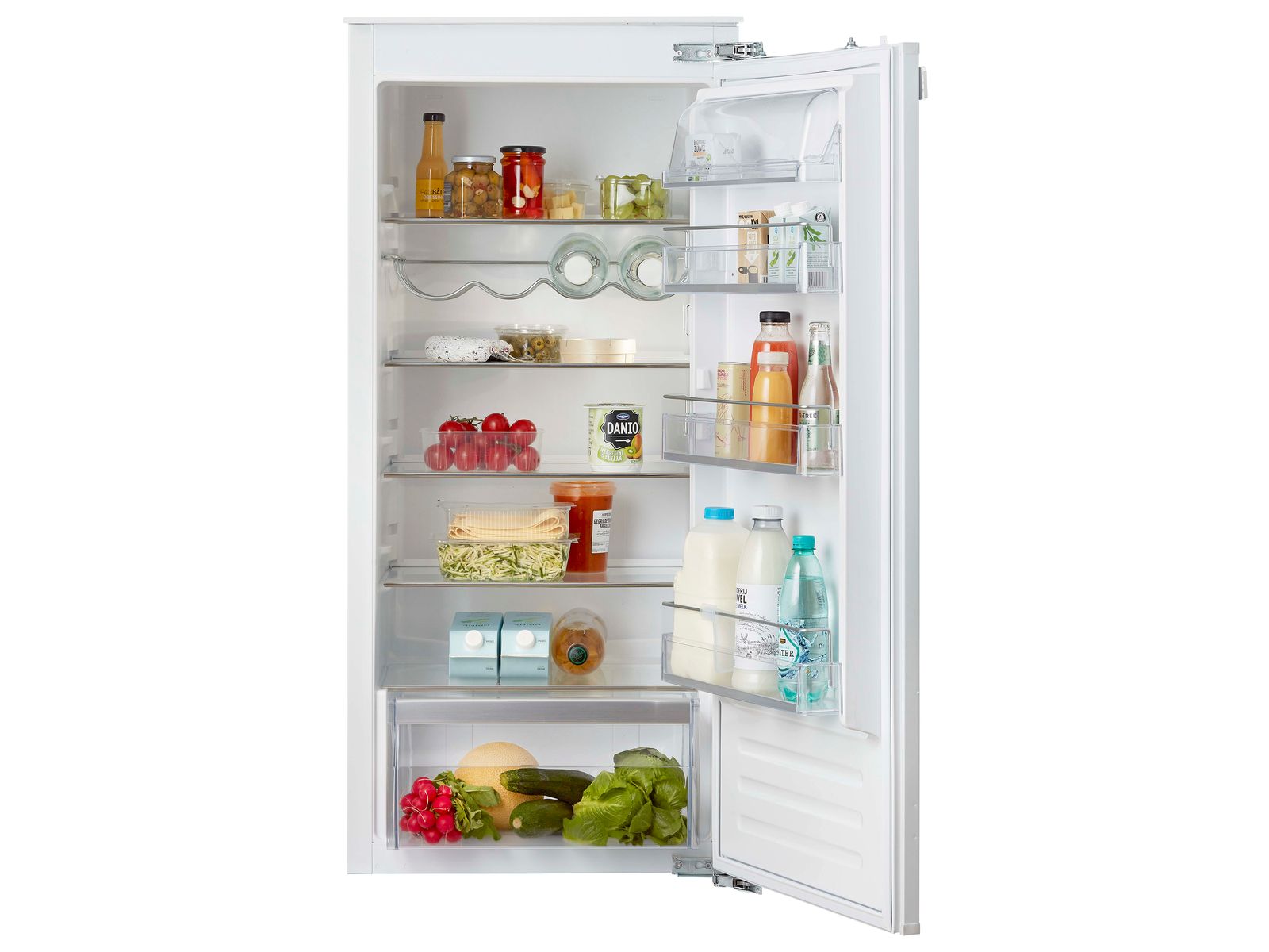 De koelkast is uitgerust met transparante, verstelbare deurvakken met luxe afwerking, waaronder een afsluitbaar boter- en kaasvak.