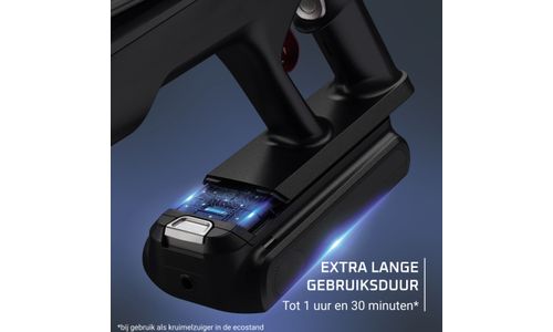 - Uitneembare batterij met lange levensduur die tot 1,5 uur** meegaat, om je hele huis schoon te maken zonder tussendoor op te hoeven laden