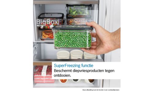 Wanneer je de vriezer opent om er producten in te leggen gaat de binnentemperatuur omhoog. Dat kan leiden tot ontdooien en smaakverlies. De SuperFreezing functie zorgt ervoor dat nieuwe producten snel invriezen en voorkomt dat andere etenswaren in de vriezer ontdooien. Toestellen met een automatische invriesfunctie schakelen terug naar normaal bedrijf wanneer de gewenste temperatuur eenmaal is bereikt en voorkomen zo energieverspilling. Hierdoor behouden ingevroren etenswaren hun smaak, zelfs wanneer nieuwe producten worden toegevoegd.